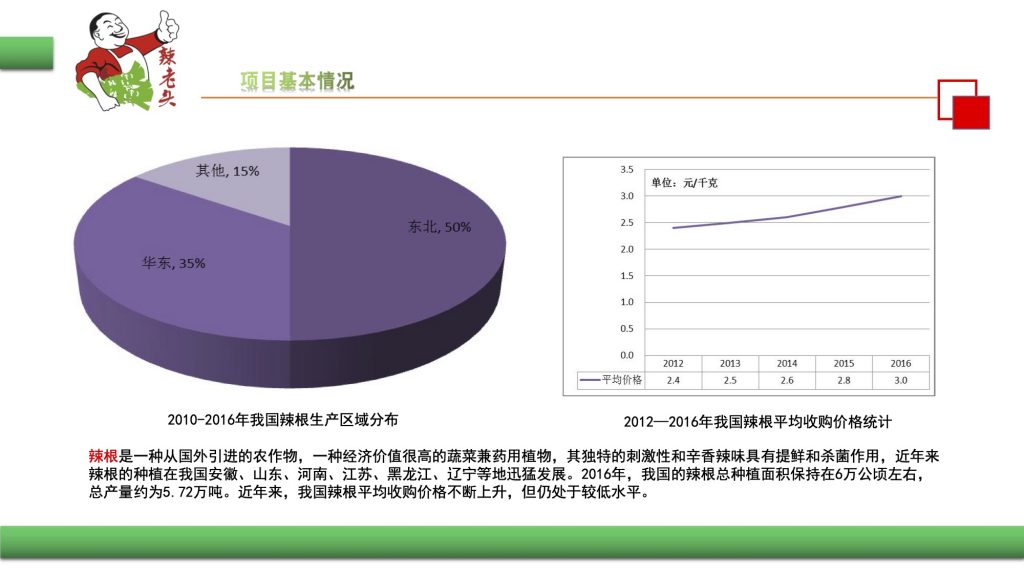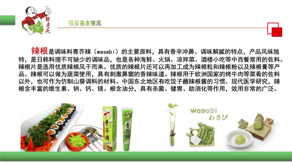 公司集基地种植、加工生产包装为一体,产品分为保鲜辣根、辣根片、辣根粒、辣根粉等。丰富的从业经验、专业化的加工生产,确保了产品质量不断提升,赢得了客户良好的赞誉。