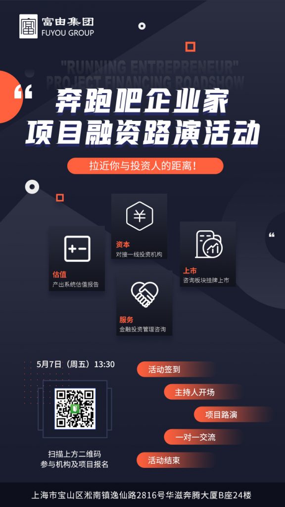 和往期一样,第二期“奔跑吧企业家”项目融资路演活动将于5月7日(周五)在富由集团举行,我们将邀请优秀的项目和主流投资机构,继续为企业家们提供高效对接,一对一的深入沟通机会,帮助优秀的项目获得融资,助力创新型企业获得更高速成长的机会。